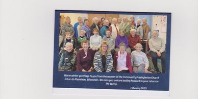 During Winter, our Presbyterian Woman's Group gathers over a luncheon to prepare a message to their members who have left for warmer climes. The message reads, "Warm winter greetings to you from the women of the Community Presbyterian Church in Lac du Flambeau, Wisconsin. We miss you and are looking forward to your return in the Spring." A personal greeting is written inside the card. In the interest of fellowship, this activity promotes an ongoing feeling of belonging to something worthwhile.